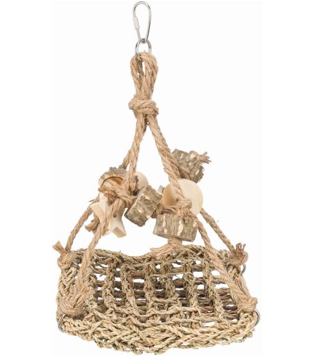 Lekehuske til fugl og tamrotter! 19x19 cm Mange fugler liker å klatre og da kan en lekehuske være et godt alternativ til fuglen din. Trixie Lekehuske er laget i samarbeid med Walsrode World Bird Park og er laget av sjøgress og tre. Den har en huske slik at den kan henges opp i taket i buret. Husken passer for fugler og tamrotter. Da lekehusken er laget av sjøgress og tre, gjør det ingenting om fuglen eller tamrotten din gnager på den, men hvis den begynner å spise på materialet, anbefaler vi at du fjerner leken. ...