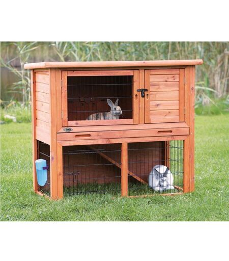 Trixie Natura Utebur 2 etasjer Dette praktiske uteburet er laget i tre og har to etasjer, noe som gir ekstra plass og større muligheter for variasjon. Buret passer for kaniner og andre gnagere, som for eksempel marsvin. Buret er laget av lasert furu og har takpapp på taket. Den nederste etasjen er utstyrt med et stabilt gitter som gjør at dyrene dine får et godt overblikk over omgivelsene. Dyrene tar seg mellom de to ulike etasjene ved hjelp av en rampe. Buret kan åpnes fra toppen via to luker på forsiden av den øverste etasjen samt via én luke på forsiden av den nederste etasjen. Merk at burets nederste del ikke har noen bunn – kompletter gjerne med kompostgitter eller lignende for bedre rømningssikkerhet! Mellom over- og underetasjen er det en praktisk luke som gjør at du kan dra plastbunnen ut av overetasjen – dette sørger for ekstra enkel rengjøring! Størrelse: Bredde: 116 cm Dyp: 63 cm Høyde: 97 cm Trixie Natura Utebur 2 etasjer er kompatibel med utehager fra Trixie! ...