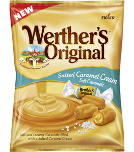 Werthers originale Salted Caramel Cream i fra Storck. Myke karameller fylt med saltet karamell. Ingredienser: Glukossirap, socker/sukker, vegetabiliskt fett/fedtstoffer (palm, shea), kondenserad SKUMMJÖLK/SKUMMETMÆLK, fuktighetsbevarande medel: sorbitolsirap, HELMJÖLKSPULVER/SØDMÆLKSPULVER, MJÖLKSOCKER (LAKTOS/LAKTOSE), GRÄDDE/FLØDE (2,9 %), kondenserad VASSLE/VALLE/MYSE (från MJÖLK/MÆLK), SMÖR/SMØR (1,9 %), VASSLEPULVER/VALLEPULVER/MYSEPULVER (från MJÖLK/MÆLK), farinsocker, salt, emulgeringsmedel: lecitin/lecithiner (SOJA), rörsockersirap/rørsukkersirup, aromer, karamellsockersirap/ karamelsukkersirup, malda/malede HASSELNÖTTER/HASSELNØDDER. KAN ÄVEN/OGSÅ INNEHÅLLA/INDEHOLDE DELAR/BESTANDDELE AV MANDEL OCH/OG ANDRA NÖTTER/NØDDER.Næringsinnhold Pr 100g:Energi 1927 kJ / 460 kcalFett 20,3 gvarav mättat fett 11,2 gKolhydrat 68,0 gvarav sockerarter 43,1 gProtein 3,0 g Salt 0,81 g ...