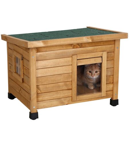 Dette fine kattehuset fra Kerbl er laget av kinesisk treverk av høy kvalitet som er malt med beskyttende tremaling, noe som betyr at det kan stå ute i all slags vær. For at pusen din skal komme inn i huset, er det værbestandige gjennomsiktige lameller - som beskytter mot både regn og vind. I tillegg til døren er det også et lite vindu som slipper inn dagslys for katten din. Beina på huset kan også justeres i høyden for å være lett tilpasset katten din. Kattehuset kan også brukes som et trygt hjem for en familie med kattunger. Deretter kan du fjerne lamellene slik at ungene kan komme inn og ut. Størrelse: Utvendig: 57 x 45 x 43 cm Innvendig: 48 x 35,5 cm Dør: 15,5 x 21 cm Farge: Klassisk... ...