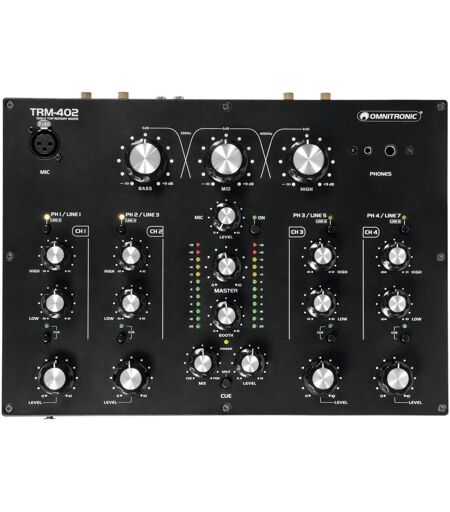 Omnitronic TRM-402 4-kanals rotary mikser er en vintage-stil anaglog mikser designet for DJ-er. TRM-402 rotary mikser har 4 kanaler totalt med 2-bånd EQ på hver kanal så vel som phono/linjebytting. En av de mest unike funksjonene er den 3-bånds frekvensisolatoren som kan brukes til å lage overganger sømløs blanding mellom sanger. Også inkludert er en Kill cut-funksjon som lar deg eliminere hver av de tre frekvensbåndene for allsidige miksekapabiliteter. TRM-402 har vintage ALPS potensiometere komplett med et 12-sifret stereo LED nivåmeter og en master nivåkontroll. Innganger er inkludert for både mikrofon og hodetelefoner på toppen av enheten for beleilighet. ...