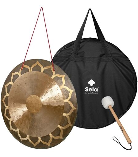 Sela 28" Wind Gong Lotus er ideell for lydterapi meditasjon og musikalske opptredener der langvarige rike vibrasjoner er avgjørende. Denne 70 cm lange gongen er håndlaget i Kina av en unik bronselegering og produserer dype ekspansive toner som varierer avhengig av hvor og hvordan den blir slått på. Den nesten flate overflaten kombinert med en subtilt vridd finish og matt gullskimmer bidrar til den akustiske dybden og den visuelle sjarmen.Det mest iøynefallende elementet er det inngraverte lotusmotivet på den ytre kanten som symboliserer åndelig renhet og opplysning. Gongens brede frekvensområde gjør den til en fantastisk opplevelse enten den brukes i velværesammenheng eller som en dramatisk perkusjonseffekt i orkestre. Hver gongong leveres med en lønnehåndtert klubbe med fløyelsbelagt hode for jevne slag og en bæreveske for sikker oppbevaring og transport. ...