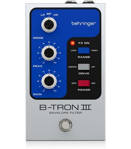 B-Tron III Envelope Filter Behringer B-Tron III Envelope Filter er ideelt for musikere som ønsker å fange de ikoniske funk-tonene fra 70-tallet. Med en helt analog optisk krets gir den en jevn naturlig respons som reagerer dynamisk på spillet ditt. Enten du er ute etter klassiske wah-stil sweeps eller vokallignende teksturer har denne pedalen det du trenger.Tre valgbare filtertyper: lavpass båndpass og høypass lar deg forme lyden din mens opp/ned-modusene gir både Wah- og Wow-effekter. Følsomhetskontrollen sikrer kompatibilitet med gitarer basser og keyboards og tilpasser effekten til instrumentets dynamikk.En range-bryter gjør at du kan fremheve enten dype vokallignende toner eller skarpe høye overtoner. Pedalen er plassert i et slitesterkt kabinett i vintage-stil har true bypass for signalintegritet og drives av et 9 V-batteri eller en valgfri strømforsyning. ...