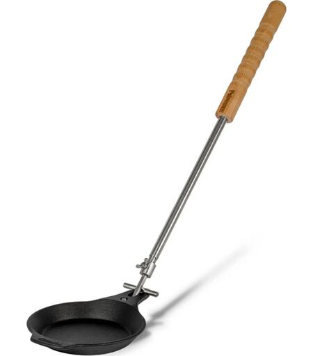 Campfire Pan Cast Iron fra Petromax er en stekepanne i støpejern med et teleskopisk håndtak som kan tas av, perfekt å bruke direkte på bålet. Hold deg på en trygg avstand fra bålet med denne stekepannen. Robust materiale som er naturlig non-stick Justerbar lengde på håndtaket fra 58 cm til 95 cm Klar til bruk – pannen er allerede innbrent ...