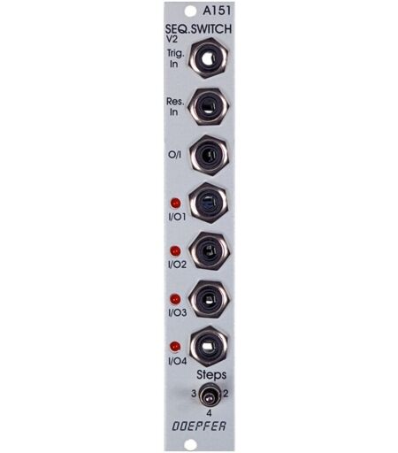 Doepfer A-151 Quad Sequential Switch er en enkel og kraftig løsning for bytte mellom opptil 4 inngangssignaler. Utstyrt med fire inngangs- / utgangskontakter pluss en felles utgang / inngang gir A-151 deg en sekvensiell bryterløsning i et kompakt og intuitivt format. Hver gang en puls registreres ved modulets utløserinngang er den vanlige utgangen / inngangen koblet til neste inngang / utgang i kjeden. Etter den fjerde I / O vil den neste utløseren gjøre det tilbake til første I / O igjen. A-151 har også en nullstillingsinngang som bytter O / I tilbake til første I / O når en positiv puls mottas. Fire LED-er er tilstede ved siden av hver I / O for å gi visuell tilbakemelding om hvilken I / O-funksjon som er aktiv. ...