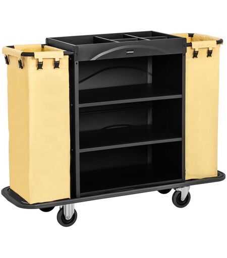 Daglig rengjøring er alfa omega på ethvert hotell. Med denne servicevognen UNICLEAN 142B kan du effektivt gjøre orden ved hjelp av de to tilhørende skittentøyskurvene. Med denne servicevognen vil renholderpersonalet alltid ha alt som trengs til renhold til enhver tid. Rengjøringsvognen består av en malt stålramme. Vognen er utstyrt med to holdere for skittentøyposer. Rengjøringsvognen leveres med to vasketøyposer. Med en gang skittentøyskurven er full, kan du enkelt bytte den ut med en annen. Du kan vaske vaskeposene i vaskemaskinen ved 40 ° C etter behov. Trallen har tre hyller for optimal plassutnyttelse. Vektkapasiteten på vognen er 150 kg. som gjør at du lett kan frakte rent sengetøy og håndklær eller frakte skittent sengetøy. Rengjøringsvognen sørger for at det kan gjøres rent på flere hotellrom på rad uten unødig avbrudd. Benkeplaten har fem beholdere hvor du kan lagre mindre gjenstander og holde dem adskilt. Denne hotelltrallen er usedvanlig manøvrerbar. Vognen er utstyrt med TPR-hjul som beskytter gulvet mot skader og som samtidig er enkel å håndtere, selv på trange rom. Hjulene svinger 360 grader og er veldig lett å manøvrere. I tilfelle at plassen blir for smal, forhindrer gummi-støtfangerne på kantene av vognen at skader skjer. To sterke bremser sikrer stabilitet. ...