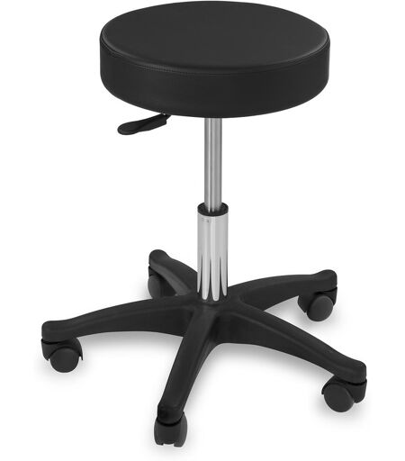 Det er mange jobber og mange situasjoner der du må sitte for å jobbe. Det være seg på skjønnhetssalongen, frisøren, kontoret eller en legepraksis. Aversa er en fleksibel, men komfortabel arbeidskrakk, designet av Physa. Krakkens høykvalitetsdesign og holdbarhet, så vel som dens mange praktiske små ekstrautstyr, gjør den til det perfekte valget for profesjonelle som ofte jobber i sittende stilling. Kjernen i arbeidskrakken Aversa er setet som har en diameter på 34 cm. Dens høykvalitets utførelse og materialer er produsert i henhold til tyske kvalitetsstandarder og overgår lignende avføring. Fyllet er laget av 7,5 cm skummateriale som er både mykt og formbevarende. Du kan komfortabelt bruke krakken i lang tid. Skumfyllet er skreddersydd og er trukket med imitert skinn, nøyaktig sydd og fri for bretter. Trekket i imitert skinn er stramt over den høykvalitets kryssfiner som stabiliserer seterammen. Doble sømmer på sitteflaten øker holdbarheten til sømmen. Rullekrakken Aversa har maksimal fleksibilitet og mobilitet med jevntgående, støysvake, roterbare hjul. Den 5-stjerners korsformede basen garanterer en jevn kjøring av de fem utskiftbare hjulene. Setet er roterbart med 360 °C som lar deg fullføre alt nødvendig arbeid uten begrensninger. Avhengig av arbeidsplassen eller brukeren kan høyden på arbeidskrakken justeres mellom 45 - 59 cm for å spare deg for ryggsmerter. Høyden på setet kan justeres individuelt til dine behov med et praktisk håndtak som fungerer med gasstrykk. Gasstrykkfjæren sørger for en svært komfortabel og polstret sittestilling. Materialene (plast og stål) er svært enkle å rengjøre. Polstringen i kunstskinn er støv- og vannavstøtende og blir ikke skitten under bruk. Du kan jobbe med væsker eller støvete stoffer uten å måtte bekymre deg for at avføringen blir permanent skitten. Arbeidskrakken har et kompakt og stilig design og bærer uanstrengt en belastning på opptil 150 kg. De polerte stålelementene og den svarte fargen har en tidløs eleganse og arbeidskrakken passer optisk inn i alle rom. ...