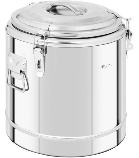 Denne termobeholderen er beregnet beregnet for en trygg og ukomplisert transport av varme og kalde mat- og drikkevarer. Royal Catering har spesialisert seg i restaurantbransjen og har designet denne termobeholderen for restauranter, hoteller, industrikjøkken, kantiner og cateringfirma. Om du verdsetter funksjonalitet, holdbarhet og et elegant design er denne 22-liters termoholderen med dobbel isolering et godt valg for å holde mat og drikke varm over lengre tid. Termobeholderen har en kapasitet på 22 liter. Beholderen er konstruert med hele to lag av rustfritt stål, mellom de to lagene er det innlagt isolering. Takket være den doble konstruksjonen bevarer termosbeholderen temperaturen på opp til 12 timer, før den begynner å falle. Termobeholderen kommer med et lokk av rustfritt stål som hjelper å holde på temperaturen. Lokket har to hengsler som er enkle å åpne og lukke og samtidig sørger for en hygiensik transport. Enheten er også utstyrt med to ergonomiske håndtak som gjør transporten enkel. Takket være rustfritt stål av første klasse innfrir denne beholderen strenge hygienekrav. Den glatte overflaten sørger for resistens mot vann- og matrester. Mat og drikker bevarer sin aroma i beholderen. Termobeholderen er praktisk og enkel å gjøre ren. ...