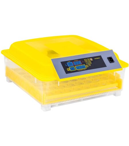 If you want to incubate eggs, be them of duck, goose or quail, you are in the right place. You can handle this responsible task with the semi-automatic egg incubator IN-48DDI from Incubato. This breeder is ideal for commercial use. With this device you can hatch up to 48 chicken eggs, 132 quail eggs or 24 goose eggs at the same time. On the clear LED display, you can learn all the information you need. Data about the temperature, humidity, incubation day and egg turning time are all conveniently presented in one place, to make your work easier. Achieve a satisfactory slippage rate! Incubating eggs is an extremely interesting experience, which requires a lot of dedication, good planning, flexibility and good powers of observation. The scope of delivery includes a water dispenser and an egg candler. Monitor the egg development with the candler. Observe the eggs with the bright light in order to see inside the shells. This will give you a good insight into whether the embryo development is going according to plan. Additionally, thanks to the transparent lid you can observe the incubation process very closely! The automatic incubator is equipped with an integrated fan that ensures an even inside temperature. Accordingly, you can provide your eggs with a better air circulation and evenly distributed heat. 48 standard sized eggs, or alternatively 24 goose eggs can be incubated at the same time. Depending on the types of eggs you want to hatch, you will require up to 35 incubation days. With the wrong device, your electricity costs will increase. So, save cash with the IN-48DDI incubator! Operated with only 90 watts, this device is very cost-efficient. This egg incubator impresses with its low load and compactness. With a weight of approx. 3.1 kg, you can effortlessly transport the device wherever you please. Thanks to its small dimensions, storage is no problem either. Further advantages of this device are the completely removable lid and the removable tray, also called egg insert. This makes cleaning very easy. Temperature control is the most important part of the incubation process. You can use the digital temperature display to set the temperature between 30-39.5°C, with a high degree of precision. Once preconfigured, you don't have to worry about adjusting the temperature. The SMART control system continuously provides the desired temperature. The automatic egg turning mechanism tilts the eggs to 45 degrees from right and left for 10 seconds, which happens every 2 hours. The device is characterised by its user-friendly, digital control panel. Many different functions such as humidity or temperature can be set. You can also see the previous days and the frequency of egg turns on the LED display. You can also set the low temperature alarm, high temperature alarm, low humidity alarm, temperature upper and lower limit. The fact that this device is in constant contact with water during the incubation process has been very important to safety. The... ...