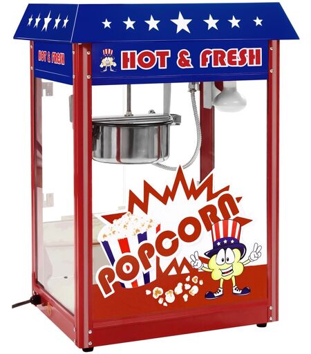 Med popcornmaskinen fra Royal Catering kan du produsere opptil 5 kg eller 16 liter popcorn i timen. Den effektive 1500 W varmeelement, sammen med den automatiske termostaten og et høykvalitets varmeelement, bringer maskinen raskt til driftstemperatur. Som sådan kan du servere din første porsjon bare 2 minutter etter at du har slått på popcornmaskinen. Når den først er spratt, holder varmhold-funksjonen kjernene friske og sprø. Den integrerte belysningen og den amerikanske retrodesignen viser tilbudene dine på en iøynefallende og attraktiv måte. Det er veldig enkelt å bruke popcornmaskinen: Over dørene, ved siden av strømknappen, er det tre vippebrytere. Start oppvarmingen med HEAT-bryteren. For å unngå at popcornet brenner seg, trykk på TURN for å starte røresystemet. Non-stick-belegget på gryten hindrer også at popcornen setter seg fast. Bruk POWER & LIGHT for å slå på lyset og varmeelementet i bunnen av kammeret. Det medfølgende basissettet inkluderer en praktisk skje for porsjonering av ferdig popcorn og et 0,5-liters målebeger for nøyaktig dosering av olje, sukker eller maiskjerner. The housing of the popcorn machine is made of high-quality stainless steel, therefore can be cleaned easily. The load capacity of the device is 16 litres and can produce up to 5 kg of popcorn per hour. Popcornmaskinen er konstruert med langvarige materialer og høykvalitets utførelse for å tåle lengre bruksperioder. Huset i rustfritt stål er like sterkt som de herdede glassrutene. Takket være serveringsklaffen kan du ta ut og porsjonere popcornet uten problemer. Hull i bunnplaten lar upoppede kjerner eller overflødig olje falle ned i fangstskuffen under. Skuffen, som vannkokeren, er avtakbar, slik at du enkelt kan rengjøre begge deler. When purchasing the popcorn machine RCPR-16.1 you get a full accessory set, which is consisting of a scoop and measuring cup, free of charge. The practical measuring cup is ideal for filling and measuring bags of popcorn also for filling the machine. The measuring cup has a capacity of 0.5 litres and serves the exact dosage of oil, sugar or corn kernels, needed to make delicious popcorn. The special design of popcorn machines provided by Royal Catering This popcorn machine impresses not only with its functionality and performance but above all with its extraordinary design. This is modelled on the classical devices of the US and spreads American life and feeling at every event. The wide variety of popcorn machines provided by Royal Catering offers various possibilities of applicable designs. The popcorn makers are available in simple black (model RCPW-16.2) as well as in eye-catching red (model RCPW-16.3). Even heat-resistant stickers decorate many of our models, for example the popcorn machines RCPW-16.1 and RCPR-16.1. Many more, specially designed models complete the product range and inspire not only popcorn lovers. Use the popcorn machines to stand out from the crowd and inspire your customers with tasty popcorn made from... ...