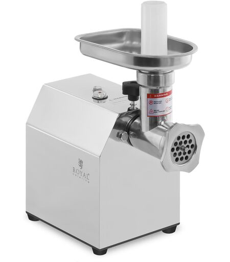 The RCFW 70-600ECO meat mincer from Royal Catering's butchers equipment is a practical, easy to use tool for food processing. The meat mincer can be used commercially such as in butcher shops or restaurants as well as privately at home. The high performing 600 Watt motor effortlessly powers the device required for shredding. With appropriate energy consumption, the meat mincer can process up to 70 kg of food per hour. Special ventilation slots on the side of the unit ensure sufficient ventilation during performance peaks. The RCFW 70-600ECO electric meat mincer from Royal Catering's gastronomy product range stands out through its high durability and particularly high quality workmanship. The stainless steel casing and parts are considerably more stable than comparable models. With every rotation, meat is effectively pushed against the sharp cross blade via worm shaft - and subsequently pressed through the perforated disc. The holes with a diameter of 5 or 7 mm supply evenly minced meat mass, which can optimally be used for further processing. The unit can be switched on for continuous use on position 1 via the rotary knob. It also has a return flow function, to relieve any stuck food and push it out. Therefore, you do not have to dismantle the unit to remove food if it is blocked. This allows you to save time and money. The meat mincer is particularly quiet, even at continuous use. The casing and the skid-proof rubber feet, on which the meat mincer stands suitably absorb noise. Sensitive surfaces are not scratched through the feet's rubber coating. Disassembly and cleaning is quickly carried out thanks to the meat mincer's well thought out and advantageous design. Important hygienic standards, which are required for food processing are therefore ensured. Various cleaning and care products designed for food processing units can be used for cleaning. ...