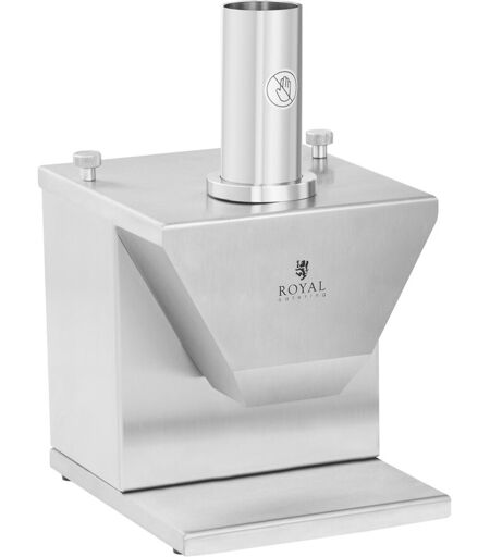 They get sold in the thousands per day. One of the most popular German snacks - the currywurst! That is why it is very important to be able to easily and quickly cut sausages into even sized bites, and also to cut other sausages, like wieners, bockwurst or bratwurst. Complement your snack bar with the electric sausage cutter RCSC-35E from Royal Catering, the perfect little helper for preparing the perfect currywurst or sliced sausage for stews or goulash. The electric sausage cutter has been specially designed for professional gastronomy and is mainly used in snack bars, bars or restaurants. You can prepare many different kinds of sausages with a diameter of up to 4.7 cm in the long filling tube. The thickness of the slices can be easily determined and adjusted to your needs. They can be as thin as 5 mm or as thick as 35 mm. Perfectly formed slices fall down. There is enough space for placing a small plate or container to catch them. Easy and fast – The engine is powered by 105 watts. You will be able to process a large quantity of sausages in a quick, easy and inexpensive way. You only need to push the button and the sausage vanishes into the filling tube. The sharp stainless steel double-sickle blade slices the sausages into even pieces. When you let go off the button, the machine turns off by itself. The device has an overheat protection. Special ventilation holes make for an additional ventilation and cooling so that the engine inside the casing does not overheat. If the temperature is too high, the device turns off automatically. After continuous use for 30 minutes, you should take a short break. The device only works when the protective cover is put into place. The electric sausage cutter is made from robust, non-corrosive stainless steel. The high-quality material is very durable and easy to clean. The upper cover and the double-sickle blade are removable and dishwasher-safe. The device is a space-saver and measures 24.5x18.5x32.5. It is a practical tool for any kitchen. ...