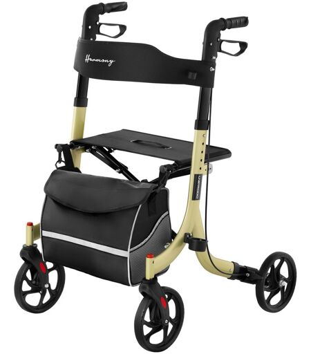 Rullatoren Harmony er champagnefarget og gir deg både sikkerhet og mobilitet. Den utmerker seg gjennom en utpreget manøvrerbarhet og gir deg den hjelpen du behøver for å gå stabilt. Materialene den er laget av er robuste og egner seg til å brukes utendørs. Rullatoren er sammenleggbar, noe som gjør den enkel å transportere. Den stabile kontruksjonen av aluminium, gjør den sammenleggbare rullatoren ekstremt lett samtidig som den har en bæreevne på opptil 136 kilogram. For å gå i en behagelig og sikker posisjon, kan du stille inn håndtakene til rullatoren mellom 88 til 98 cm. Rullatoren er også utstyrt med en praktisk holder til en stokk. De fire store hjulene av gummi (TPR) sørger for gode bevegelsesmuligheter. Hjulene er sklisikre, lager lite lyd og lager ingen spor i gulvet. Med en diameter på 20,3 cm egner de seg for ulendt terreng. Den er enkelt å styre med de dreielige forhjulene. Rullatoren er også utstyrt med bremser på håndtakene. Denne rullatoren har komfortable håndtak som er ergonomisk utformet. Det robuste setet har et integrert rygglene i rammen, noe som er praktisk for små pauser. Foran på rullatoren er det en veske som også er utstyrt med en refleks. Det er også reflekser på siden av hjulene. Dette sørger for større sikkerhet, når du går ute om kvelden. Med et par håndbevegelser kan rullatoren klappes sammen. Det er enkelt å ta med rullatoren på reise når man har lagt den sammen. Siden den ikke veier så mye, er den ikke tung å løfte inn i bilen. Merk: Dette er ikke en ganghjelpemiddel i medisinsk forstand og ikke ment for medisinske formål. ...