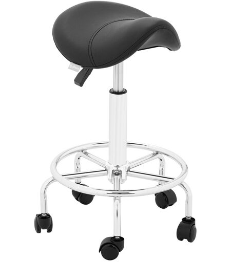 Denne komfortable sadelstolen PHYSA FRANKFURT BLACK fra physa har et sete formet som en sal, som navnet antyder. Med sine mange justeringsmuligheter og hjul som ruller lett, passer denne sadelstolen i ethvert skjønnhetsforetak, spesielt om du foretrekker å justere både høyde og helling. Med dette oppnår du høy komfort og stabilitet. Ergonomiske sadelstolen fremmer en sunnere sittestilling, lindrer belastningen på ryggraden og sørger for at musklaturen slapper mer av. Du oppnår høy mobilitet med denne stolen, selv på liten plass og stolen har en vektkapasitet på 150 kg. Den er produsert etter høy produksjonsstandard. Denne verdifulle salongstolen tilbyr en rekke bruksområder i tatoveringsstudioer, helse- og velværeklinikker, lege- og tannlegekontorer, hjemme eller på kontoret. Sadelstolen korsformet fot med fem glattvalsende, 360° -svingende hjul som gjør det enkelt å skyve eller trekke stolen. Den korsformede basen sikrer også stabilitet. De lettvalsende gummihjulene svinges lett samtidig som at hele sadelstolen kan roteres 360 grader, noe som er spesielt nyttig når du gjør arbeid som krever mobilitet. Sadelstolen har også en praktisk fotstøtte. Høyden på stolen kan justeres mellom 55.5 centimeter og 69.5 centimeter. For å justere setehøyden, trykk ganske enkelt spaken under setet i respektive retning, og setet beveger seg jevnt opp eller ned om ønskelig. Den maksimale bæreevnen er på 150 kilo som gjør den til en praktisk følgesvenn på jobb eller hjemme. Seteputen er fylt med tykt skum og dekket smidig PU, noe som gir kundene ekstra komfort. Materialet er støv- og vannavvisende som gjør det svært lett å rengjøre samtidig som at det holder sitt profesjonelle utseende. Materialer av høy kvalitet sikrer en spenstig konstruksjon med et stilig og tiltalende utseende takket være forkrommet jern og elegant sort belegg. ...