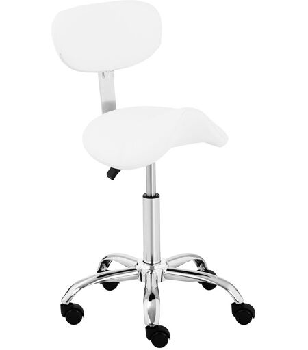 Enten det er på et legekontor, frisørsalong, tatoveringsstudio eller i en skjønnhetssalong er den manøvrerbare og høydejusterbare sadelstolen PHYSA HAMBURG WHITE fra physa er komfortabel å sitte på i timevis. Ergonomiske sadelstolen fremmer en sunnere sittestilling, lindrer belastningen på ryggraden og sørger for at musklaturen slapper mer av. Den svært stabile sadelstolen med ryggstøtte har en bæreevne på opp til 150 kg. Foten har fem armer og er laget av forkrommet stål og fem hjul som roterer 360°, noe som gjør det lettere å skyve stolen. I tillegg til nylonhjulene som ruller lett, kan hele salongstolen også dreies, noe som er spesielt nyttig når du utfører arbeid som krever mobilitet i trange rom. Eksempelvis en frisør som sirkler rundt kunden eller tannlegen på legekontoret. Høyden på sadelstolen justeres mellom 60 og 80 cm for å tilpasse enhver arbeidssituasjon. For å justere høyden presser du bare spaken under setet riktig retning. Setet på 38 x 36 cm beveger seg deretter opp eller ned takket være den effektive gasstrykkfjæren. Det hvite setetrekket på setet og ryggstøtten kan enkelt fjernes takket være glidelåsen. Den skumfylte seteputen og det doble høydejusterbare ryggstøtten er dekket med smidig PU imitert skinn. Materialet er støv- og vannavvisende samtidig som at det holder sitt profesjonelle utseende. Materialer av høy kvalitet sikrer en spenstig konstruksjon med et stilig og tiltalende utseende takket være forkrommet jern og elegant hvitt trekk. ...