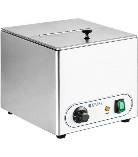 Pølsevarmeren RCHW-1000 fra Royal Catering egner seg for gatekjøkken, små restauranter og bensinstasjoner. RCHW-1000 er den ideelle løsningen for oppvarming av de fleste pølser til ønsket serveringstemperatur. Temperaturområdet til pølsevarmeren kan stilles inn fra 30 – 90 °C med dreiebryteren og holder seg stabil takket være den integrerte termostaten. Varmeelementet på 1 000 W sikrer kjappest mulig oppvarmingstid. For å hindre utvanning av smaken på pølsene legges de på en stålinnsats og varmes opp til ønsket temperatur av det oppvarmede vannet. For å sikre at det maksimale innholdet på 10 liter forblir varmt viser de to statuslysene om apparatet er skrudd på (oransje) og om den ønskede temperaturen er oppnådd (grønn). Huset til RCHW-1000, med unntak av dreiebryteren og det varmebestandige håndtaket til lokket er laget helt i rustfritt stål og er derfor svært lett å rengjøre. ...