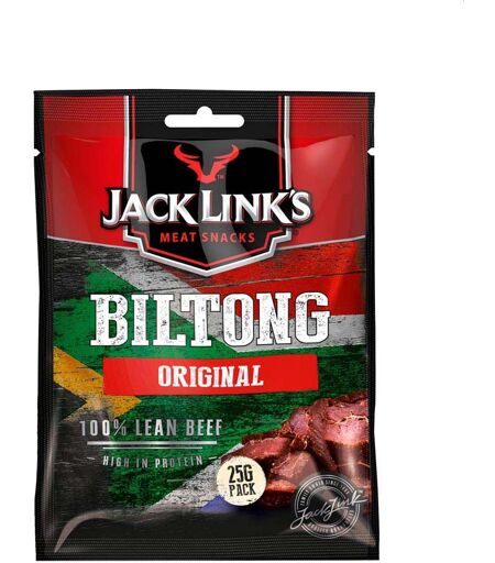 Jack Links Biltong Original meat snacks - energi-snacks av tørket storfefilèt. Perfekt for turgåere, jegere, mosjonister, eller rett og slett for alle aktive som ønsker tur-snacks med få kalorier og mye proteiner. Produktene gir en langvarig og lett metthetsfølelse og er dermed godt egnet både alene og til alle typer drikke. Kan spises både før, under og etter aktivitet. Vekt: 20 gram. Jack Link's har utviklet deres egne marinade som gir den sør afrikanske smaken. Glutenfri og lite sukker. For å produsere 100 gram med Biltong, brukes 229 gram okseskjøtt. Innhold: Oksekjøtt, edikk, salt, sukker, druesukker, krydder, maisstivelse, hvitløkspulver, løk, tomat, paprika, krydderekstrakter, gjærekstrakt, røykaroma, konserveringsmidler (natriumnitrit,kalsiumsorbat) surhetsregulerende midler (naturiumdiacetat, sitronsyre) Næringsinnhold (per 100 gram): Energi: 1257 kj - 299 kcal. Fett: 10 gram - derav mettet fett: 4 gram. Karbohydrater: 2,2 gram - derav sukker: 1,1 gram. Protein: 50 gram. Salt: 5 gram. ...