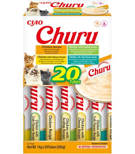 Churu Kattegodbiter Katt Creamy Chicken Varieties 20x14g Nyt forskjellige Churu-smaker i variasjonsbokser! Opplev den rene moroa og smaken av Churu i forskjellige smaker. Inneholder 4 forskjellige smaker med 5 biter av hver sort. Smaker: Kylling, Kylling med kamskjell, Kylling med ost, Kylling med krabbesmak. Slikkbare godbiter med kremaktig konsistensHøyt fuktighetsinnholdLaget med ekte tunfisk eller oppdrettskyllingGodbit med lavt kaloriinnholdKornfritt, uten konserveringsmidler, kunstige smaker eller fargerMorsomme godbiter som knytter bånd til kattene dine Kylling (30,0 %), tapioka (tørr), kamskjellekstrakt, kollagen. Guargummi (E412) 7,2 g. Aromastoffer, 2b naturlige produkter -... ...
