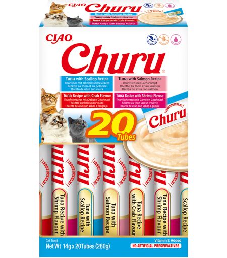 Churu Cat Treats Cat Creamy Tuna Seafood Varieties 20x14gDiscover various Churu flavors in variety boxes! Experience the pure fun and tastiness of Churu in different flavors. Contains 4 different flavors with 5 of each. Flavors: Tuna with shrimp, tuna with crab, tuna with salmon, tuna with scallop. Lickable treats with a creamy textureHigh moisture contentMade with real deep-sea tuna or farm-raised chickenLow-calorie treatsGrain-free, no preservatives, artificial flavors, or colorsFun treats for bonding with your cats Ingredients (by variety): Tuna (28.2%), tapioca (dry), scallop (1.8%), scallop extract, collagen. Guar gum (E412) 9.0g. Flavoring additives, 2b natural products -... ...