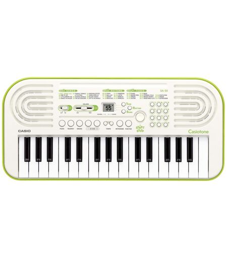 Casio SA-50 er et ideelt første keyboard for unge mennesker så vel som et flott keyboard for å ta med på reise. Med 32 små tangenter har dette instrumentet en imponerende register for en så liten formfaktor de 100 inkluderte tonene vil også gi et bredt spekter av klangfarger du kan eksperimentere med. SA-50 vil føle seg hjemme i et klasserom et lekerom øvingsrom stue eller andre steder du ønsker å lage musikk takket være dens bærbarhet. De innebygde sangene gir deg ti av de mest kjente låtene som er tilgjengelige for deg på keyboardet ditt spill med dem eller improviser en liten melodi på toppen mulighetene er dine å utforske. Lyst på flere måter å utforske på? Du kan jamme med på hvilken som helst av de 50 inkluderte rytmene fra mange forskjellige sjangre fra popmusikk til jazz. Hvis det ikke tilfredsstiller deg kan den inkluderte reverb bidra til å gi den siste smaken til lyden din. ...