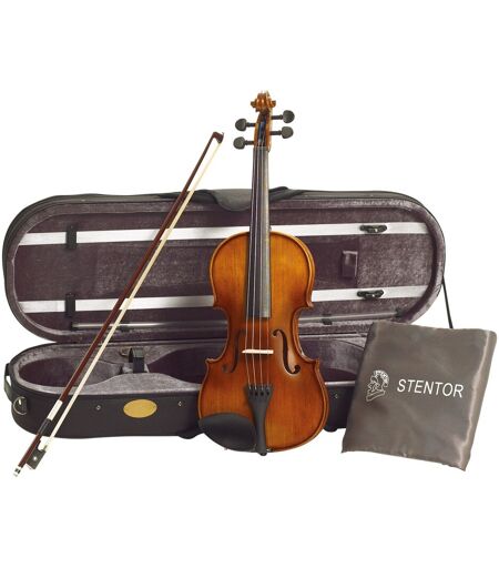 En fin fiol egnet for den fremvoksende studenten. Stentor Graduate fiolin outfit er full size og leveres komplett med alt du trenger for å komme i gang. Skåret fra solide tonewoods denne fantastiske instrumentet har en satin lakk som gir en attraktiv varm brun finish. Den har også både ebony fingerboard og pinner som muliggjør utmerket stabilitet og gir en komfortabel spillbarhet. Det ekstra kompositt-bakstykket er en fordel for Graduate da integrerte tunere gir mer nøyaktig tuning Leveres med en bulletwood-bue hygrometer og stilig oblong sak er dette fiolinutstyret designet for å bidra til å fremme din musikalske evne som fiolinist. ...