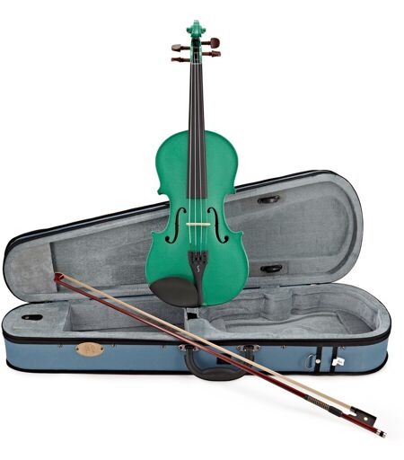 Hvem sa at det å lære fiolin måtte være kjedelig? Alle Harlequin-fioler fra Stentor kommer i lyse og glitrende farger. Denne skinnende grønne Harlequinen er konstruert av solid lønn og gran - for en tidløs og tradisjonell byggekvalitet. Stentor mener du ikke bør ofre kvalitet for design. Harlequin-fiolinen er utstyrt med en bro av god kvalitet og strengeholder med integrerte finstemmere og er designet for å tåle det daglige livet til en musikkstudent. Inkludert med fiolinen er en lett koffert med to lommer med plass til alt av tilbehør. Også inkludert er en slitesterk P&H; glassfiberbue slik at du kan begynne å øve med en gang. Merk: En naturfarget sløyfe kan leveres avhengig av tilgjengelighet. ...
