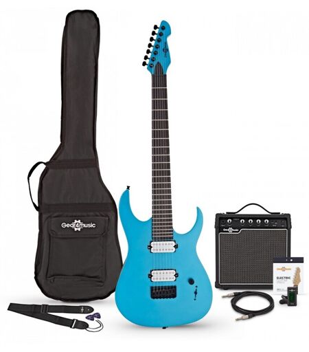 Gear4Music Harlem S 7-Strengs Elektrisk Gitar + 15 W Forsterkerpakke Blue Sparkle