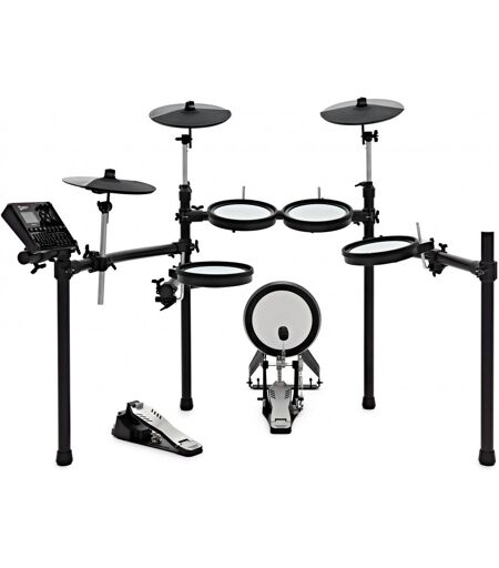 Premier PowerPlay digitalt trommesett er den perfekte blandingen av kraft og praktiskhet. Den kombinerer den autentiske lyden og følelsen til et akustisk trommesett med fleksibiliteten og kraften til et digitalt. Trommesettet har 25 forhåndsinnstilte sett som betyr at du kan oppnå flotte lyder på et øyeblikk. Hvis du ønsker å fordype deg dypere og forme din egen trommetone er det 423 samples 25 brukerdefinerte sett og et bredt spekter av DSP-effekter (Digital Signal Processing) tilgjengelig. Antall brukerdefinerte sett kan enkelt utvides ved å koble en USB-minnepenn (må kjøpes separat) til modulen for å importere og eksportere etter eget ønske. Består av 10" basstromme skarptromme og tom-trommer samt 12" crash and ride cymbaler. Mesh-padene gir maksimal realisme slik at du kan utføre med samme uttrykksnivå som du ville gjort på et akustisk trommesett. Spenningen til hver pad kan enkelt justeres via det unike spenningssystemet etter dine preferanser. Bortsett fra basstrommen inkluderer alle padsene dobbelsone-teknologi slik at du kan inkludere flere lyder som sidepinne-slag tamburiner og kubjeller. Deres hastighetsfølsomme natur sikrer at hver siste nyanse av forestillingen din blir videreformidlet. Fra stille hodetelefonøvelse til MIDI-programmering i DAW betyr det brede spekteret av tilkoblinger at PowerPlay er godt egnet til en rekke oppgaver. Innebygd praksis lar deg finpusse ferdighetene dine ved å inkludere to moduser og 25 forhåndsinnlastede sanger mens du kan ta opp og eksportere MIDI-filer med innspillingsfunksjonen. ...