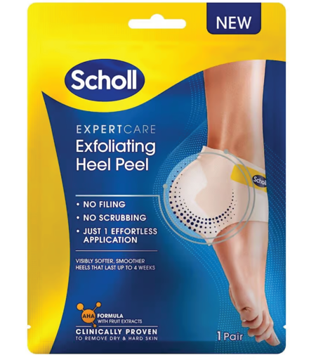 Scholl Eksfolierende Hælmaske er en eksfolierende hælmaske som bidrar til å behandle tørr og hard hud på hælene. Scholl Eksfolierende Hælmaske bidrar til å fjerne døde hudceller på hælene uten bruk av fotfil eller fotskrubb. Fotmasken inneholder blant annet AHA-syrer med fruktekstrakter som bidrar til å skånsomt fjerne overflødig hud slik at føttene vil føles mykere og fuktet. ...
