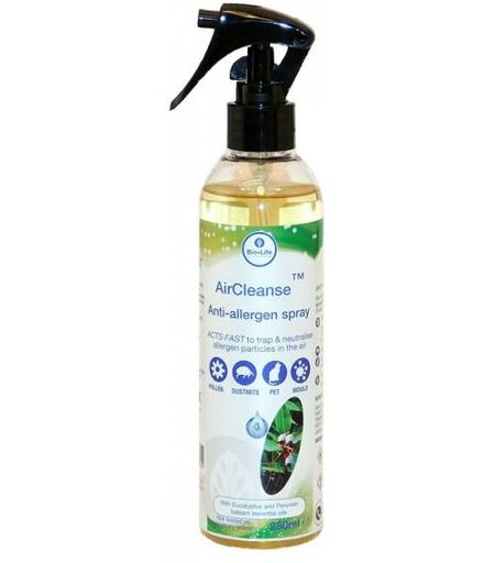 BIO-LIFE AIRCLEANSE ALLERGIHEMMENDE SPRAY 250mlAir Cleanse Spray- Anti-allergen romspray som fjerner pollen, husstøvmidd og kjæledyrallergener samt muggsporer som forårsaker høysnue, nysing, tungpustethet, astma, eksem og elveblest.Alle de vanlige allergenene i hjemmet blir luftbårne på et eller annet stadium. Disse partiklene er de viktigste årsakene til øye-, nese-, hals- og pustevansker, og kan også bidra til hudirritasjoner. Å fjerne disse partiklene fra luften er avgjørende, og det er rollen til AirCleanse ™.Reduserer allergenmengden med minst 65% alene, opp til 85% når det brukes i kombinasjon med PetalCleance.Enkel i bruk da den kommer som luftsprøyte. Den inneholder negativt ladede aktive stoffer som feller partikler og essensielle oljer som bryter dem ned.Hyppighet:Rommene skal sprayes med 1 sprut per 5 kubikkmeter. Påføringshyppigheten avhenger av det fornærmende allergenet.Pollensesong: Daglig med dører og vinduer lukket.Dyr og støvmid: To ganger i uken i tre uker og en gang i uken deretter.Hvis du har besøkende som er allergiske, husk at dette er den perfekte “raske” løsningen! ...