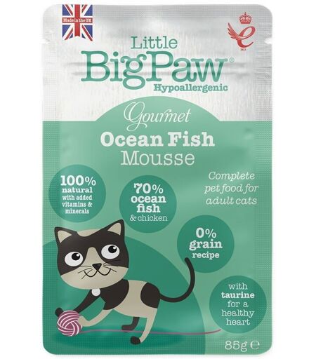 Little BigPaw Gourmet Fiskemousse fra Atlanterhavet: Naturlig og næringsrikt våtfôr i mousseform Little BigPaw Gourmet Fiskemousse fra Atlanterhavet er en delikatesse for kresne katter. Med sin kremete moussekonsistens og uimotståelige fiskesmak fra Atlanterhavet, kylling og kyllinglever, blir dette våtfôret en favoritt hos de fleste katter. Samtidig gir det en komplett og næringsrik kost for en sunn og vital katt. Fordeler: 100 % naturlig: Ingen konserveringsmidler, smaksstoffer, fargestoffer, soya eller melkeprodukter. Komplett fôr: Inneholder alle vitaminer og mineraler som katten din trenger. Høyt kjøttinnhold: 70 % fersk fisk fra Atlanterhavet, kylling og kyllinglever for en lettfordøyelig og velsmakende proteinkilde. Støtter immunforsvaret: A-, D- og E-vitaminer for sterke tenner og bein. Sunn hud og pels: Omega-fettsyrer for en blank og myk pels. Bra for hjerte og øyne: Taurin for kattens vitale organfunksjoner. Laget i Storbritannia: Førsteklasses ingredienser og produksjonsprosesser. Fleksibel servering: Kan gis separat eller blandet med tørrfôr. ...