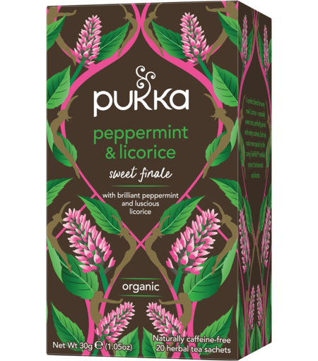 Pukka Peppermint & Licorice er en herlig økologisk urtete med smak av peppermynte og lakris. Pukka Peppermint & Licorice er en deilig te med naturlig og søt smak fra lakrisrot og ren friskhet fra ferske peppermynteblader, satt sammen til en perfekt blanding av deilige smaker. 100 % økologisk. Koffeinfri. Alle Pukkas teer er sertifisert Fair for Life, og flere inneholder også Fair Wild™ ingredienser. Pukka er også medlem av 1% for the planet. ...
