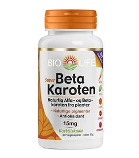 Betakaroten er kroppens egen kilde til vitamin A, fordi det omdannes til A-vitamin i kroppen ved behov. Betakaroten er en viktig antioksidant som kan redusere celleskader og tidlig aldring. Årsaken er at betakaroten er fettoppløselig og lagres blant annet i hudcellene hvor det styrker cellene og stimulerer pigmentdannelsen. Dette forbereder huden før soling og gir en raskere og mer varig brunfarge. Det kan dermed motvirke solbrenthet og soleksem. Dessuten er betakaroten beskyttende mot infeksjoner ved at det styrker slimhinnene i både tarmen, luftveiene og urinveiene. Naturlig betakarotenPå markedet finnes det flere ulike produkter som inneholder betakaroten. Enkelte av disse er syntetisk framstilt og inneholder kun en enkelt type karoten. Bio-Life Super Betakaroten inneholder naturlig alfa- og betakaroten fra planter. Det er brukt et bredspektret betakarotenkompleks fullt av verdifulle karotenoider som opptas godt av kroppen: alfa- og betakaroten, kryptoxantin, zeaxantin, lutein, lykopen. Produktet inneholder også selen, C-vitamin, E-vitamin og sink som bidrar til å beskytte cellene mot oksidativt stress (for eksempel ved soling). Anbefales ved solingBio-Life Super Betakaroten kan brukes av alle som ønsker å forberede huden på soling, for eksempel i forbindelse med ferie eller dersom du benytter deg av solarium. Har du spesielt følsom hud, kan du med fordel bruke Super Betakaroten hele sommerhalvåret for å forebygge solskader. Men uansett: husk å smøre deg inn med solkrem også, hvis du skal være lenge ute i sola. Innhold:Spirulina (Spirulina platensis), kapsel (hydroksypropylmetylcellulose), farge (titandioksid), d-alfatokoferolacetat, rispulver, askorbinsyre, blåbærekstrakt (Vaccinium myrtillus), gulrotekstrakt (Daucus carota), naturlig betakaroten (Blakeslea trispora), ringblomstekstrakt, druekjerneekstrakt, tomatekstrakt (Lycopersicon esculentum), svart pepperekstrakt (Piper nigrum), algeekstrakt (Haematococcus pluvialis), L-selenmetionin. 1 kapsel Bio-Life Super Betakaroten inneholder: A-vitamin i form av betakaroten 15 mg C-vitamin i form av askorbinsyre 60 mg E-vitamin 30 mg Storfløyelsblomstekstrakt (Lutein og zeaxantin) 8 mg Lykopen (fra tomat) 4 mg Algeekstrakt (Astaxantin) 1,5 mg Selen 100 mcg Sink 10 mg Dosering og bruk:Anbefalt dosering er 1 kapsel daglig med mat eller vann. Du bør begynne med Super Betakaroten 1-2 uker før soling. Fortsett med 1 kapsel daglig i perioden du soler deg. For å beholde brunfargen, kan du ta 1 kapsel daglig også etter perioden med soling. ...