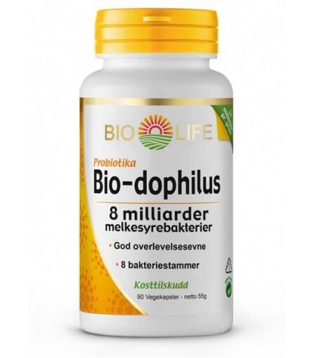 Biolife Bio-Dophilus er tabletter mot feriemage som inneholder 8 milliarder melkesyrebakterier (probiotika) per kapsel. Bio-Dophilus brukes ved ubalanse i den normale tarmfloraen, og kan hjelpe mot treg og løs mage. Biolife Bio-Dophilus brukes ved urolig mage, for eksempel på reise. Bio Dophilus anbefales også ved alle plager hvor årsaken kan være mage-tarmforstyrrelser, for eksempel: Forstoppelse/diarè, oppblåsthet/kolikk, mage- og tarmkatarr, soppinfeksjon (Candida Albicans), dårlig ånde, allergi, hudproblemer, dårlig næringsopptak, matintoleranse, opphopning av avfallsstoffer/giftstoffer, nedsatt immunsystem og etter bruk av antibiotika. Bio-Life Bio-dophilus inneholder ubrutte kjeder av frysetørrede mikroorganismer og Psylliumfrø – 16 milliarder gode melkesyrebakterier per døgndose. Bio-Dophilus er sammensatt av 8 ulike bakteriestammer og inneholder minimum 8 milliarder bakterier per kapsel ved utløpsdato. Kontakt med fuktighet og varme aktiviserer disse fra sin dvale. Med begrepet probiotika menes levende mikroorganismer som har en gunstig helseeffekt. Ordet er satt sammen av forstavelsen «pro» som har latinsk opphav og kan oversettes med for og det greske «bios» som betyr liv. Laktobakterier eller melkesyrebakterier på folkemunne, er en gruppe bakterier som gjennom alle tider har vært i menneskers kosthold. De finnes naturlig i mange matvarer som bl.a. youghurt, ost, oliven, surkål, salte agurker, røket og gravet fisk og i spekepølser. Laktobakterier finnes også i tarmens naturlige bakterieflora hos både dyr og mennesker. Laktobakterier kalles også for probiotika. Bio-Life er en serie med naturlige kosttilskudd, hvor bredspektrert sammensetning og råvarer av høyeste klasse er sentralt. Bio-Life utvikler og tar frem spennende produkter med filosofien om at summen av flere ingredienser som arbeider sammen, er bedre enn en frittstående ingrediens, så lenge en har nok av den aktive ingrediensen fra hver råvare. Inneholder 8 mrd. melkesyrebakterier per kapsel. Døgndose:1-2 kapsler Innhold:90 kapsler ...
