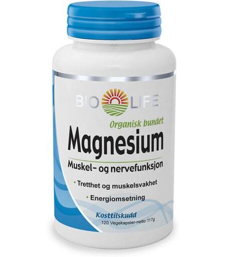 Magnesium er viktig for en lang rekke livsviktige funksjoner i kroppen. Forskning viser at magnesium er godt for hjertet og muskulaturen, nødvendig for energiproduksjonen og er gunstig ved stress fordi det også har betydning for nervesystemet. I tillegg er magnesium nødvendig for immunforsvaret og hormonproduksjonen. Magnesium fremmer opptaket av kalsium i kroppen. Det kan derfor være aktuelt å bruke Magnesium for å opprettholde en sterk benbygning. Bio-Life Magnesium virker beroligende og kan derfor være et godt supplement hvis du har søvnproblemer. Det kan også være aktuelt med tilskudd av magnesium hvis du er plaget av leggkramper (for eksempel i forbindelse med graviditet). I tillegg kan magnesium redusere PMS-plager og dessuten rygg- og magesmerter under menstruasjon, på grunn av sin muskelavslappende effekt. Stress og trening øker behovet for magnesium både hos kvinner og menn. Derfor kan Magnesium også være virksomt mot en stressrelatert spenningshodepine. Ekstra kosttilskudd av Magnesium kan også være gunstig hvis du har høyt blodtrykk. Innhold: Magnesiumaspartat, magnesiummalat, havrestrå (Avena sativa), brennesle (Urtica dioica), kapsel av cellulosepulver og vegetabilsk glyserol. Bio-Life Magnesium inneholder 175 mg magnesium per kapsel. Bio-Life Magnesium produseres uten magnesiumstearat og stearinsyre for bedre opptak og utnyttelse. Inneholder ikke gluten, melk/laktose, gjær, sukker eller syntetiske tilsetningsstoffer. Produsert etter GMP-standard. 120 kapsler Bruksveiledning: Anbefalt dosering er 2 kapsler daglig, gjerne like før leggetid (eller eventuelt annen dosering i samråd med naturterapeut eller alternativinteressert lege). ...