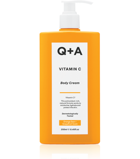 Q+A Vitamin C Body Cream er en body lotion med vitamin C som bidrar til å fukte og gi næring til huden. Q+A Vitamin C Body Cream er formulert med beroligende sheasmør som gir rikelig med fuktighet til huden, naturlige oljer fra sitrusfrukter og ingefærrot som bidrar til å gi huden næring og antioksidanter. Fuktighetskremen absorberes lett i huden og bidrar til en jevnere hudtone med en naturlig glød. Med en frisk duft av appelsinskall og grapefrukt. Viktigste egenskaper: Vitamin C bidrar til å beskytte huden mot frie radikaler og stimulerer cellefornyelsen, som gir gode anti-age fordeler. Vitamin C bidrar også til at huden holder på mer fuktighet enn normalt, lysner og gir huden en frisk glød. Ingefærrot-ekstrakt er en antioksidant som bidrar til å fremme en jevn og myk hud, med økt kollagenproduksjon. Den har anti-inflammatoriske egenskaper og bidrar også til å lindre irritert hud. Sitrusolje er rike på vitamin C og antioksidanter og bidrar til å styrke kollagenproduksjonen. Eterisk olje fra appelsin og grapefrukt har både beroligende og oppløftende egenskaper, og bidrar til å tilføre huden fuktighet og en naturlig glød. Passer til alle hudtyper. Uten parfyme. Dermatologisk testet. 96,7 % naturlige ingredienser. Vegansk. ...