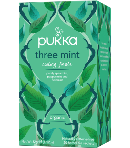 Pukka Three Mint er en smaksrik, økologisk urtete med frisk smak av mynte. Pukka Three Mint er en frisk urtete som inneholder tre av verdens fineste, økologiske myntesorter: grønnmynte, peppermynte og åkermynt, som samlet skal kunne gi deg en avkjølende følelse. 100 % økologisk. Koffeinfri. Alle Pukkas teer er sertifisert Fair for Life, og flere inneholder også Fair Wild™ ingredienser. Pukka er også medlem av 1% for the planet. ...