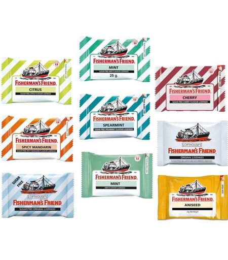 Venn, kompis, partner, bestevenn, sjelevenn – det spiller ingen rolle hva du kaller oss. Fisherman’s Friend ønsker å være ved din side for å minne deg på din egen styrke. Og som ekte venner er vi der for deg på både gode og mindre gode dager. Så gjør deg klar til å møte hverdagens utfordringer.Disse selges som en 3pk med 3 standard poser på 25g. Velg ønsket smak. Fisherman's Friend Salmiakk 25 g Smaken for alle saltlakriselskere! Fisherman's Friend med salmiak og menthol smak.Ingredienser: Søtstoff (sorbitol), aromaer (lakrisekstrakt, mentol, ammoniumssalt av glysirrinsyre, peppermynteolje), ammonium klorid, antiklumpemiddel (magnesiumstearat). Sorbitol kan virke avførende ved stort inntak. Personer med høyt boldtrykk bør unngå for stort inntak an lakris.Fisherman's Friend Honey&Lemon; 25gIngredienser: Søtstoff (sorbitol), aromaer (honning-sitron, mentol), antiklumpemiddel (magnesiumstearat), syre (sitronsyre), søtstoffer (sukralose, acesulfam k).Fisherman's Friend Citrus 25gIngredienser: Søtstoff (sorbitol), aromaer (sitrussmak, mentol), antiklumpemiddel (magnesiumstearat), syre (sitronsyre), søtstoffer (aspartam, acesulfam k), fargestoff (kurkumin). sorbitol kan virke avførende ved store inntak. inneholder en fenylalaninkilde.Fisherman´s Friend Sukkerfri Tropical 25gFisherman´s Friend Sukkerfri Tropical er en halstablett med smak av mentol og frukt. Den har en lindrende effekt på halsen, og gir frisk pust når du trenger det mest. Selges i pose på 25 gram.Ingredienser: søtningsmiddel (sorbitol, sukralose, acelsulfam-K), aromastoff (tropisk fruktaroma som inkluderer reddik/safrantistelkonsentrat, mentol, vanillin), klumpeforebyggende middel (magnesiumstearat), syre (sitronsyre).Inneholder ca: Sjekk alltid original emballasjen.Næringsinnhold Per 100 g:Energi 1031 (kJ)Energi 247 (kcal)Fett 1.30 g / hvorav mettede fettsyrer 1.28 gKarbohydrater 93.69 g Hvorav sokkerarter 0.10 g Protein 0.004 g Salt 0.001 g ...