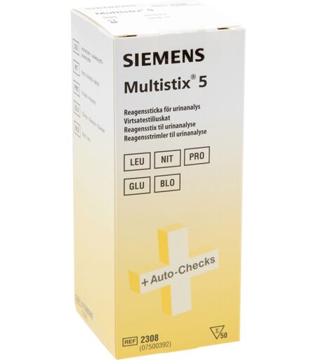 Siemens Multistix 5 2308 reagensstrimler til urinanalyse er teststrips for måling av blod, glukose, protein, nitritt og leukocytter i urinen. Testen måler innhold av følgende stoffer i urin: blod, glukose, protein, nitritt og leukocytter. Samle frisk urin i en ren og tørr beholder. Bland prøven før testing, og utfør testen i løpet av to timer etter prøvetaking. ...