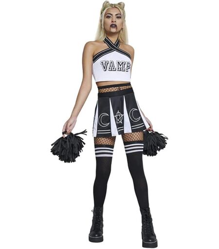 Gi din stil et vampyrisk løft med Cheerleader Vamp, den ultimate kombinasjonen av sjarm, skrekk og heiarop! Med en hvit topp og svart tekst som staver "Vamp," et skjørt dekorert med nifse symboler, lange knestrømper med hvite striper øverst og to heiadusker, er du klar til å dominere enhver cheerleading-arena med en overnaturlig sjarm. Den hvite toppen gir et klassisk preg, mens den svarte "Vamp" teksten gir en vri av mystikk og mørke. La publikum undre seg over hva skjuler seg bak det lure smilet når du hever armene for å heie på laget ditt. Det svart-hvite skjørtet er det perfekte tilbehøret for en vampyr cheerleader. Med nifse symboler som pryder hele skjørtet, skaper det en dramatisk effekt når du hopper og danser. Fra fjernt kan publikum kanskje få et glimt av uhyggelige motiver, men når du kommer nærmere, vil de bli sjarmert av din unike stil. De lange knestrømpene med hvite striper på toppen legger til et tradisjonelt cheerleader-utseende til antrekket, samtidig som de holder seg tro mot det skremmende temaet. Og hva er en cheerleader uten heiadusker? Vi gir deg to matchende heiadusker som passer perfekt til antrekket dit La din indre vampyr bli vekket til live og kle deg ut som nattens cheerleader. ...