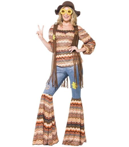Kle deg ut som en Hippie til 60- eller 70-talls party med Harmony Hippie kostyme til dame. Kostymet inneholder en fargerik, stripete, groovey bluse og blå slengbukser. Tuppen av buksene er i samme matchende mønster som blusen, buksen har også et peacemerke og blomster symbol på fremsiden av hvert lår. Medfølgende brun vest med lange frynser og samme symboler som buksen følger også med. ...