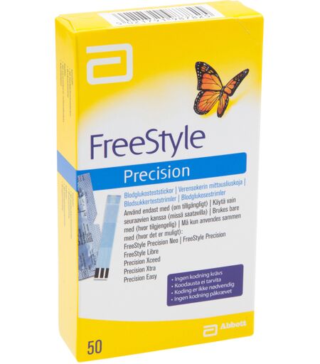 Freestyle precision er engangsstrimler til måling av blodsukker. Teststrimlene er beregnet til bruk til FreeStyle Precision, Precision Xceed og Precision Xtra blodsukkerapparat. ...