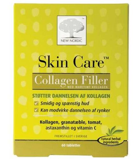 Skin Care tabletten er basert på marint kollagen som er likt det som finnes naturlig i hudens elastiske støttevev, samt et standardisert kombinasjonsekstrakt av granateple, tomat og naturlig astaxanthin. Skin Care Collagen Filler inneholder C vitamin som bidrar til normal dannelse av kollagen, som har betydning for normalt fungerende hud, og dannelse av kollagen. Dessuten bidrar vitamin C til å beskytte cellene mot oxidativt stress - for eksempel påvirkning fra solens fotoaldrende UV stråler. En normalt fungerende hud er i bedre stand til å bevare fuktigheten Ingredienser: Vitamin C 54 mg 80 mg, kollagen (fra marin kilde) 200 mg 300 mg, granateple – standardisert til 40 % ellagsyre 134 mg 201 mg, tomat ekstrakt 68 mg 90 mg, alge ekstrakt – standardisert til 2 % astaxanthin 68 mg 102 mg Innhold:60 tabletter ...