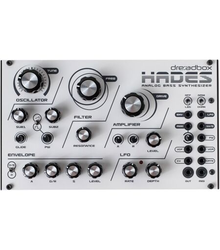 Dreadbox Hades Analog Bass Synthesizer er et kompakt monofonisk kraftsenter for lyd designet for å skape kraftige og fete basstoner. Utstyrt med en oscillator med to sub-oktaver og to bølgeformer samt en triangle -LFO med et ultrabredt område kan du lage monstrøse basslyder ved å vri på noen få skiver. I tillegg til å være en stasjonær frittstående enhet kan du fjerne det ytre dekselet for å integrere Hades i din Eurorack modulære rigg. Den "superfete" oscillatoren gir kraften og varmen kun tilgjengelig via analog syntese. Form lyden din ved å bruke det trepolede resonerende lavpassfilteret samt AD/RS-konvolutten og AR Amp-konvolutten. Press ting til det extreme ved hjelp av den innebygde OTA-forvrengningskretsen – perfekt for å lage aggressive og forvrengte basslyder. Hades har totalt 11 patch samt et integrert MIDI-grensesnitt slik at du kan bruke det med eksternt utstyr som Eurorack-moduler og synthesizere. Etter navnet sitt lar Hades deg dykke ned i dybden av lyddesign med grusom tonalitet. ...