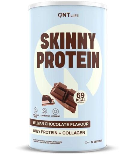 Proteinshake tilsatt kollagen og L-karnitin!Skinny Protein fra QNT kombinerer høyt proteininnhold med en lav mengde kalorier – kun 68 kcal per porsjon! Med 14 gram protein fra whey isolate, kan denne shaken bidra til å opprettholde muskelmasse og samtidig støtte fettforbrenning og restitusjon. Dens innhold av L-karnitin kan hjelpe kroppen med å forbrenne fett som energi og dermed øke energien under treningsøktene dine, mens kollagenet fremmer hudens elastisitet og styrker bindevev. Med andre ord et produkt for deg som ønsker å gå ned i vekt og samtidig ta vare på hud, hår og ledd!Skinny Protein:- 68 kcal per porsjon- Tilsatt L-karnitin og kollagen- Kan støtte fettforbrenning og restitusjonInnhold per boks:450 gramAnbefalt dosering:1-2 serveringer per dag. Bland 1 scoop (20 gram) med vann eller melk.Næringsinnhold:InnholdPer porsjon (20 g)Per 100 gEnergi284 kJ / 68 kcal1418 kJ / 339 kcalFett0,7 g3,5 g - hvorav mettet0,4 g1,8 gKarbohydrater1,2 g6,2 g - hvorav sukker1 g5 gProtein14 g70 gSalt0,04 g0,20 gL-karnitin L-tartrat200 mg1000 mgKollagen400 mg2000 mgVitamin B51,4 mg (*23%)7 mgvitamin B121 µg (*40%)5 µgVitamin B60,5 mg (*36%)3 mgVitamin B20,4 mg (*28%)2 mg* Daglig referanseverdi.Ingredienser Belgian Chocolate: Melkeproteiner (inneholder melk, emulgator soyalecitin): myseproteinkonsentrat og myseproteinisolat, kakaopulver (Theobroma cacao) 6 % (emulgator soyalecitin), kollagen, L-karnitin L-tartrat, smak, fortykningsmidler: E466/E414, søtningsmiddel: E955, vitamin B5 (Ca-D-pantotenat), vitamin B12 (metylkobalamin), vitamin B6 (pyridoksin HCL), vitamin B2 (riboflavin). Kan inneholde spor av nøtter.Ingredienser Vanilla Ice Cream: Melkeproteiner (inneholder melk, emulgator soyalecitin): myseproteinkonsentrat og myseproteinisolat, kollagen, L-karnitin L-tartrat, smak, fortykningsmidler: E466/E414, søtningsmiddel: E955, Vitamin B5 (Ca-D-Pantothenate), Vitamin B12 (metylkobalamin), vitamin B6 (pyridoksin HCL), vitamin B2 (riboflavin). Kan inneholde spor av nøtter.Må ikke brukes hvis lokk eller sikkerhetssegl er brutt/mangler. Dette kosttilskuddet skal kun brukes av voksne. Anbefalt dosering bør ikke overskrides. Oppbevares på en tørr, mørk og kjølig plass utilgjengelig for barn. Bør ikke utsettes for direkte sollys. Ikke beregnet for barn under 18 år, kvinner som er gravide eller ammende. Kosttilskudd bør ikke brukes som en erstatning for et variert kosthold. ...