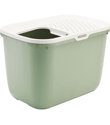 Kattetoalett modell Hop In fra Savic. Denne kattedoen har en inngang via taket som er perfekt for katter som skvetter i sanden mye og for kjæledyrseiere som har både katt og hund (eller barn) slik at innholdet i kattetoaletten forblir inne i toaletten. Det avtagbare lokket / taket har en stor åpning som gjør boksen lett å hoppe inn og ut for katter av alle størrelser. Lokket har perforerte hull og en liten helling, noe som betyr at gjenværende sand eller strø kan falle inn i esken igjen. Hop In kattedoen har en smart krok i en av hjørnene hvor du kan henge en spade. Når du tømmer kattedoen, er lokket fjernet og kan henges på kanten takket være en smart "krok" på innsiden.Tips! Sett... ...