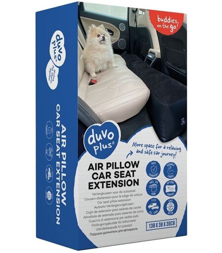 Duvo+ Oppblåsbar Setesforlengelse til Bil Svart Nyt en behagelig og trygg biltur med hunden din takket være denne smarte og oppblåsbare seteforlengelsen! Denne oppblåsbare puten fylles med luft slik at du kan fylle mellomrommet mellom frontsetene og baksetet i bilen din slik hunden din ikke tråkker nedi dette tomrommet. . Dette øker også den tilgjengelige plassen der hunden din kan ligge, noe som sikrer en trygg og avslappende biltur. Puten kan blåses opp raskt og enkelt ved hjelp av den medfølgende 12 V elektriske pumpen, som kan kobles til bilens sigarettenner. Vi anbefaler at du bruker puten i kombinasjon med et beskyttende bilteppe for bedre slitestyrke og for å redusere slitasje. Hunden din bør selvfølgelig også ha et godkjent og hundetilpasset sikkerhetsbelte. Oppblåsbar Seteforlengelse til bil Gjør bilturen mer behagelig for hunden din Elektrisk pumpe medfølger Kommer i 2 størrelser ...