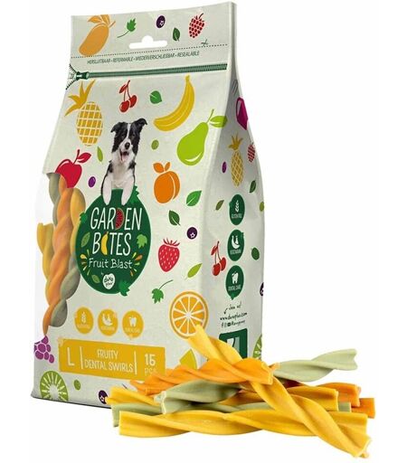 Garden Bites Dental Swirls – Smaksrike tyggebiter laget helt uten animalske ingredienser! Garden Bites Dental Swirls er et svært smaksrikt og fruktig grønnsakstygg som er veldig enkelt å tygge. Det er helt vegansk og inneholder ingen animalske ingredienser, og egner seg derfor for mange hunder med allergier. Formen på tyggebitene hjelper til med å fjerne plakk på tennene når hunden tygger og bidrar til å holde tennene i god stand. Det er også tilsatt naturlig mynteolje for å friske opp pusten. Hva inneholder Garden Bites Dental Swirls? Sammensetningen inneholder 55 % søtpotet, som blir et utmerket tilskudd til hundens kost: søtpotet inneholder masse vitaminer, kalsium og jern. Garden Bites inneholder også banan, fersken og pære som gir en utsøkt smak. S: Størrelse 13 cm, 30 stykk, forpakningsstørrelse 230 g L: Størrelse 16 cm, 15 stykk, forpakningsstørrelse 270 g ...