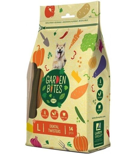 Vegetariske og glutenfrie tyggepinner som passer utmerket for større hunder. Tyggebenas utforming bidrar til å rense tennene og massere tannkjøttet. Mynteolje sørger i tillegg for at hunden får friskere pust. Duvo+ Garden Bites Dental Twisters inneholder bl.a. grønnsaker og består derfor av mye vitaminer. Inneholder også søtpotet, paprika og brokkoli som bidrar med vitamin C, B6, E og A i tillegg til kalsium, folsyre og jern. Selges i pakke med 14 stk. Husk at godbiter aldri bør være et alternativ til et balansert kosthold – de skal kun gis i tillegg som bonus eller belønning. Uansett hvor glad din firbente venn er i godbiter, er det du som eier som er ansvarlig for at den holder seg frisk og sunn. Se anbefalingene på pakken og husk at alle dyr er forskjellige – tilpass inntaket etter hva som passer din venn best! Tyggeben fremmer god tannhelse og friskt tannkjøtt. Dessuten er det en perfekt sysselsetting for hunden din. Husk at du alltid må passe på hunden når den tygger på ben samt sørge for at den alltid har tilgang til vann. ...
