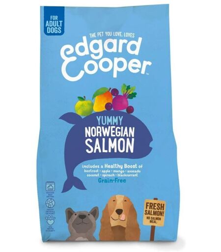 Edgard & Cooper Dog Adult Grain-Free Salmon Edgard & Cooper Dog Adult Grain-Free Salmon er et tørrfôr med smak av laks for voksne hunder. Det inneholder ingen kjøttmel eller kunstige tilsetningsstoffer. Det er i tillegg beriket med fiskeolje som bidrar til en frisk hud og blank pels! Dette fôret er fritt for kylling, storfe og korn , noe som gjør at det passer for hunder som er sensitive ovenfor disse ingrediensene. Merk! I posen med 12 kg er fôrkulene noe større enn i de mindre posene – dette for at den skal passe bedre for store hunder. Derfor bør du velge Edgard & Cooper Spesielle tørrfôrpakker som er komposterbare Våtfôret pakkes i gjenvinnbare bokser og enkeltporsjoner Kjøttet i produktene fra Edgard & Cooper har lokal opprinnelse for å påvirke miljøet så lite som mulig Edgard & Cooper donerer 1 % av salget sitt til veldedighet for hunder og katter ...